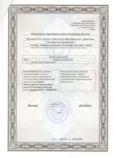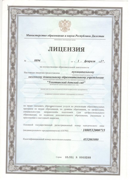 | Полное наименование образовательной организации* | Муниципальное казенное дошкольное образовательное учреждение "Тохотинский детский сад" |